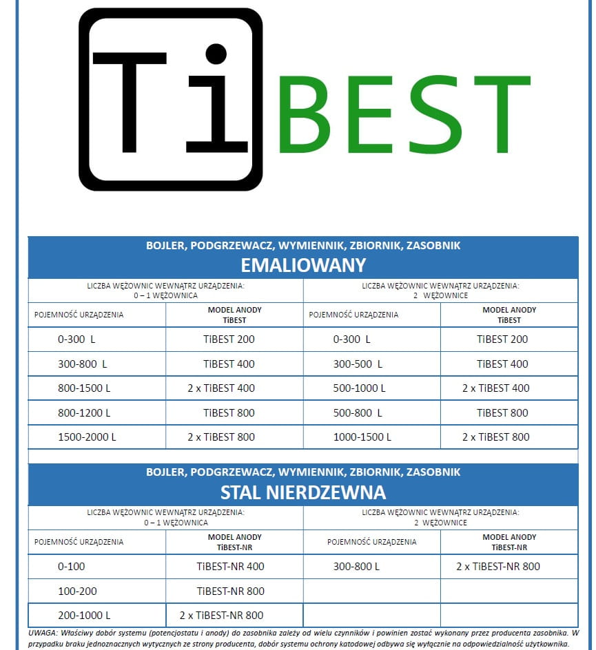 Anoda tytanowa TiBEST 200 G 1" jest przeznaczona do ochrony przed korozją emaliowanych zbiorników ciepłej wody użytkowej różnych producentów. Charakteryzuje się stabilnością oraz długą żywotnością. Praktycznie nie zużywa się podczas procesu generowania prądu ochrony katodowej, ponieważ na ich powierzchni wydziela się tlen. W praktyce anoda ta może pracować ponad 10 lat, podczas gdy przewidywany czas życia anody magnezowej wynosi 2 lata.